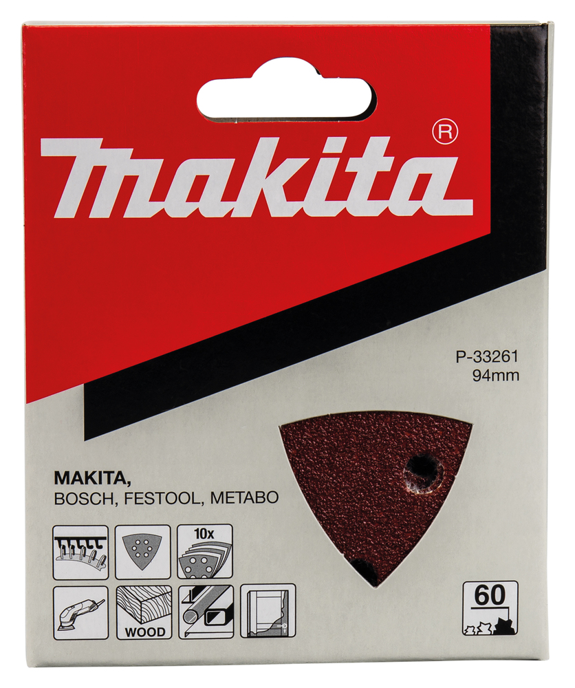 Abrasive papers with hook & loop fastening for multitools. Suitable for sanding materials such as wood and metals. Abrasive papers have a width of 94mm, a grit of A60 and are pre-punched with 6 holes. Pack contains 10 pieces.
