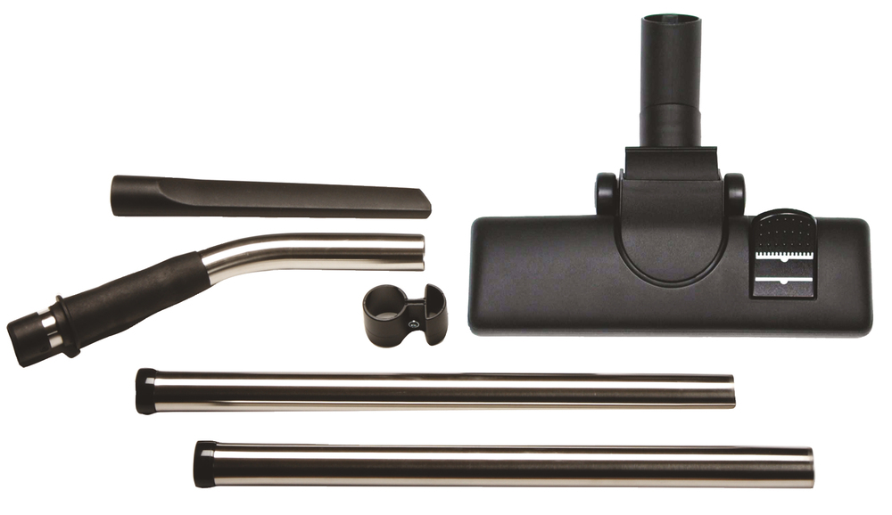 The Flooring Set includes a curved tube handle, (2) 19″ extension tubes, pipe holder, crevice nozzle, square brush nozzle, rectangular nozzle and floor nozzle