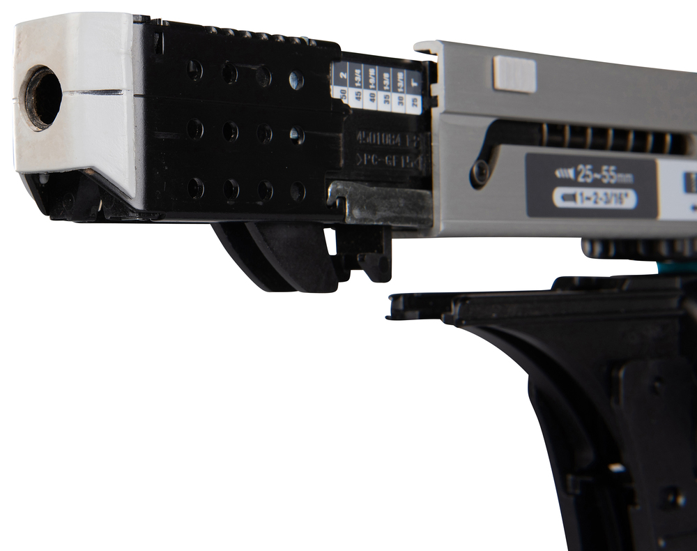 A cordless 18V LXT screwdriver for screw strips with a speed of 4 000 min-1 and a robust aluminium auto-feed system for 25 – 55 mm screws. A precise depth control switch and screw guide ensure accuracy and prevent slanted screw feeds.