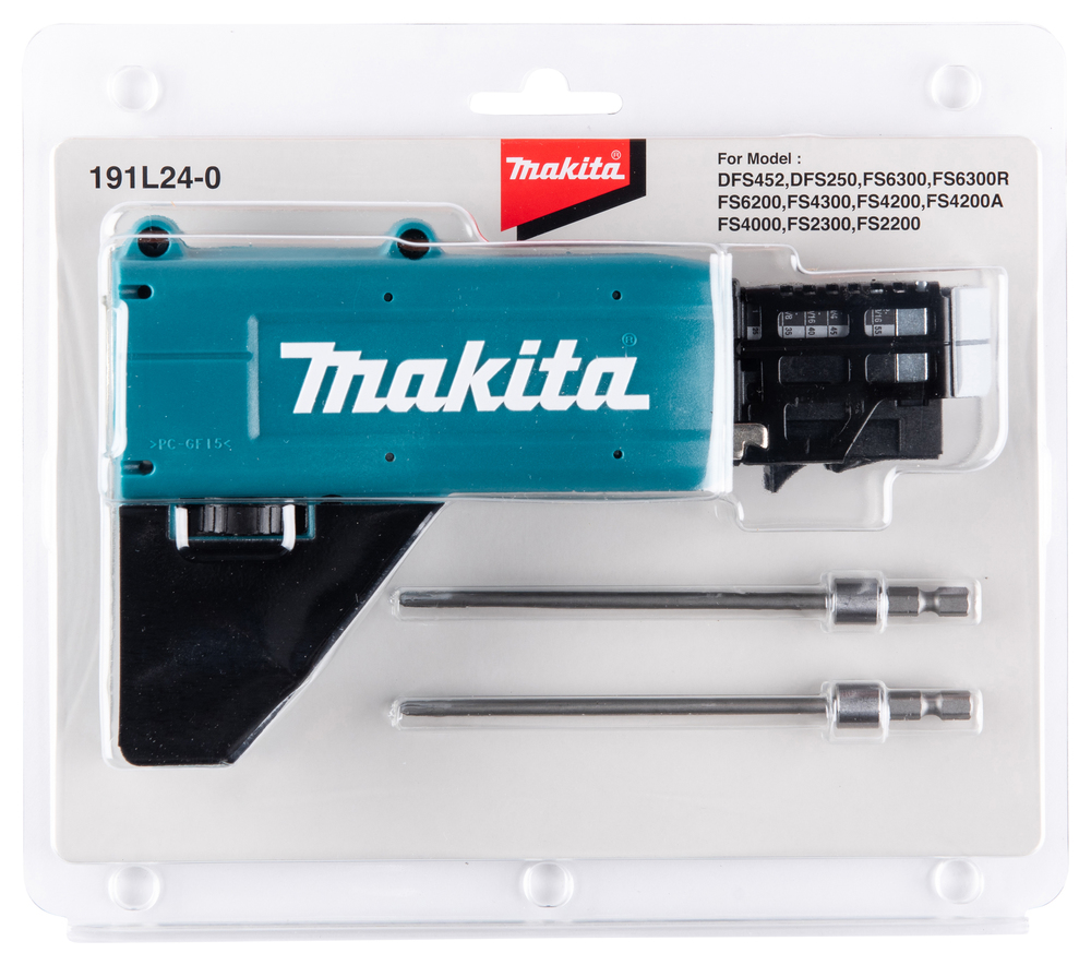 Nose piece for 25-55 mm screws. Ideal for automatically screwing screws onto ribbon with a screwdriver. The length of the screw can be adjusted on the head of the nosepiece. The depth of the screw can be perfected by means of a rotary knob. Comes as standard with two PH2 screw bits