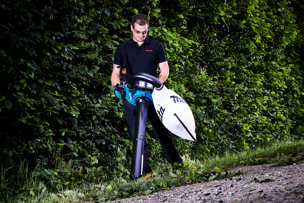 Powerful and quiet leaf blower with brushless motor. The machine shreds the leaves it sucks, so they take up less space and fall down faster. The device is light and easy to handle.