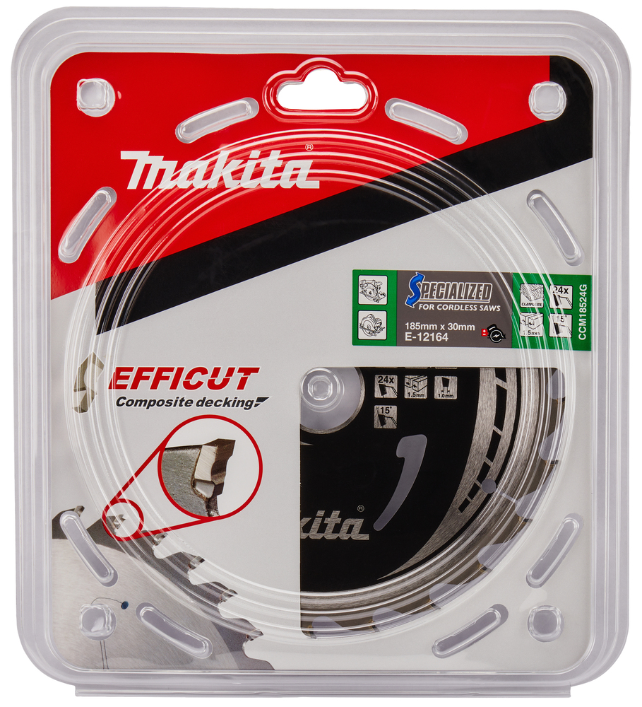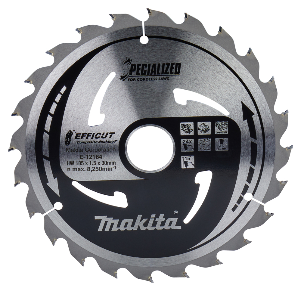EFFICUT Blade with carbide tips for efficient and rapid cutting of composite decking and wood. Ideal for cordless circular saws. This blade features a diameter of 185mm with 30mm arbor hole. With 24 teeth and 1.5mm kerf, it ensures precise and smooth cuts every time.