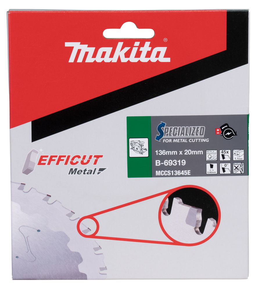 EFFICUT Blade with carbide tips for efficient and rapid cutting of metal and stainless steel. Ideal for cordless circular saws. This blade features a diameter of 136mm with 20mm arbor hole. With 45 teeth and 1.1mm kerf, it ensures precise and smooth cuts every time.