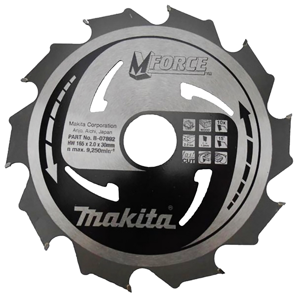 Long life M-FORCE circular saw blade with 165mm diameter for fine wood cutting. The blade leaves a clean cut and is suitable for use with hand-held circular saws. The blade has 10 teeth, a kerf of 2.0mm and 30mm arbor hole.