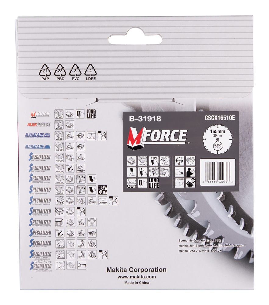 Long life M-FORCE circular saw blade with 165mm diameter for fine wood cutting. The blade leaves a clean cut and is suitable for use with hand-held circular saws. The blade has 10 teeth, a kerf of 2.0mm and 20mm arbor hole.