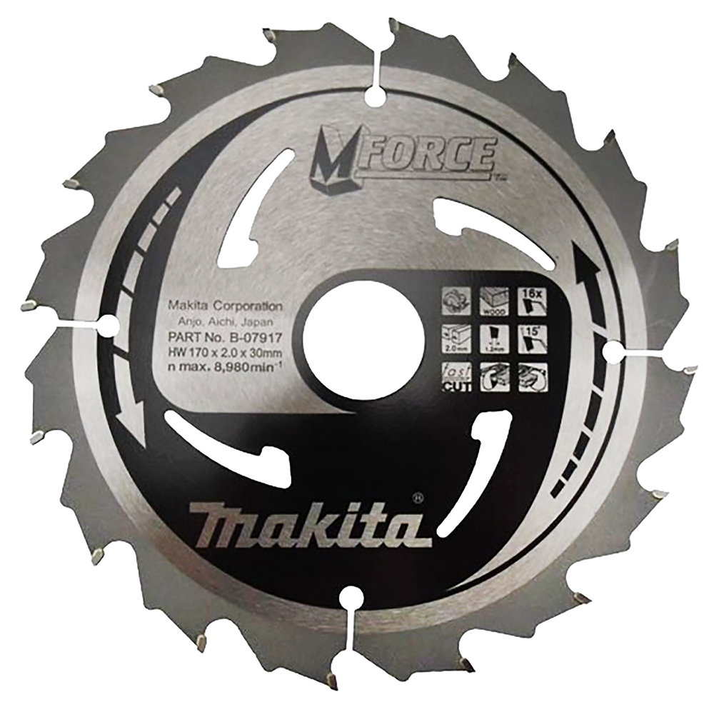 Long life M-FORCE circular saw blade with 170mm diameter for fine wood cutting. The blade leaves a clean cut and is suitable for use with hand-held circular saws. The blade has 16 teeth, a kerf of 2.0mm and 30mm arbor hole.