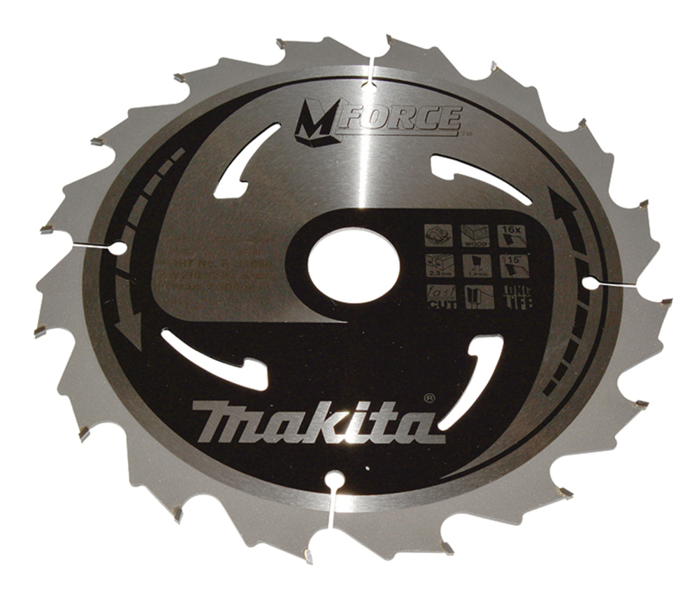 Long life M-FORCE circular saw blade with 210mm diameter for fine wood cutting. The blade leaves a clean cut and is suitable for use with hand-held circular saws. The blade has 16 teeth, a kerf of 2.3mm and 30mm arbor hole.