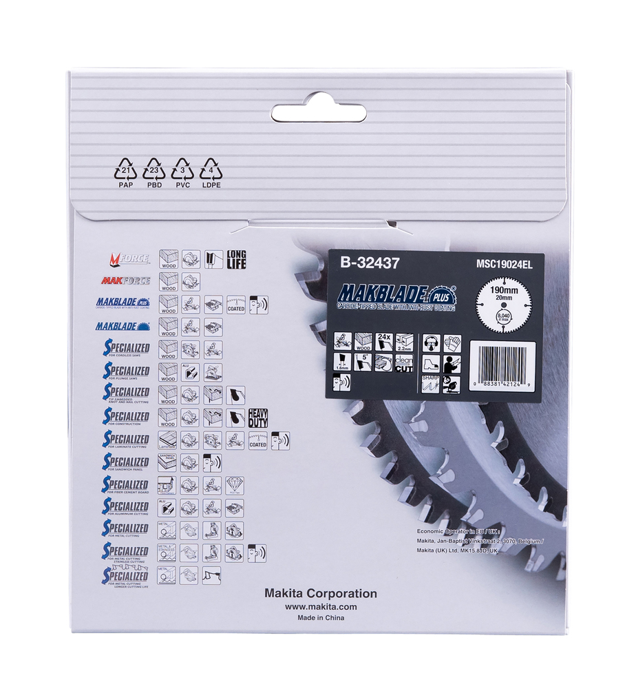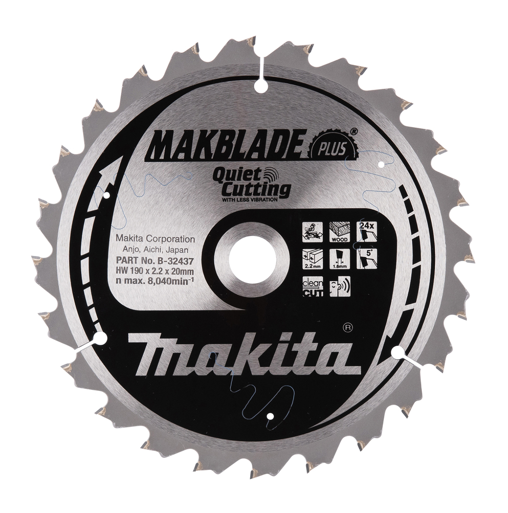 MakBlade Plus is an extremely quiet, durable and low-vibration 190mm saw blade with 24 teeth for cutting wood. Suitable to use with mitre saws and table saws. Kerf is 2.2mm and 30mm arbor hole.