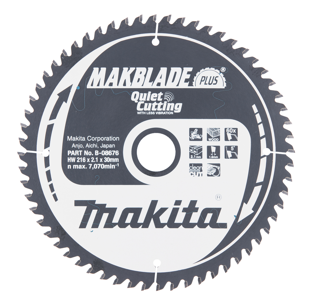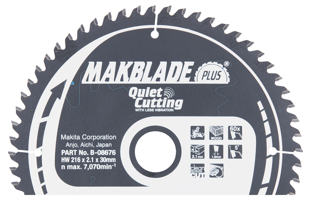 MakBlade Plus is an extremely quiet, durable and low-vibration 216mm saw blade with 60 teeth for cutting wood. Suitable to use with mitre saws and table saws. Kerf is 2.1mm and 30mm arbor hole.