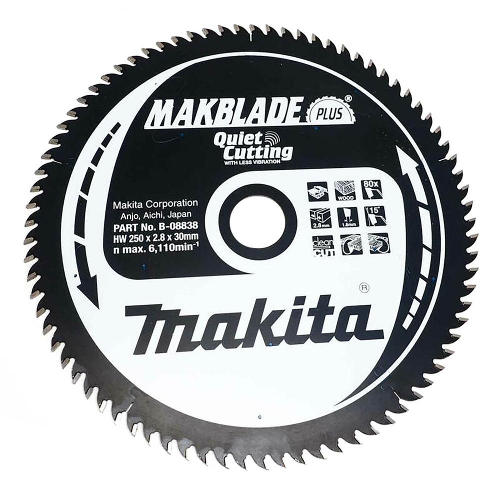 MakBlade Plus is an extremely quiet, durable and low-vibration 250mm saw blade with 80 teeth for clean cutting wood. Suitable to use with mitre saws and table saws. Kerf is 2.8mm and 30mm arbor hole.