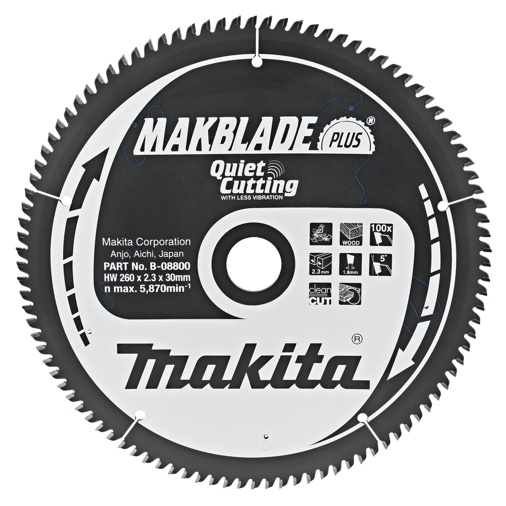 MakBlade Plus is an extremely quiet, durable and low-vibration 260mm saw blade with 100 teeth for clean cutting wood. Suitable to use with mitre saws and table saws. Kerf is 2.3mm and 30mm arbor hole.
