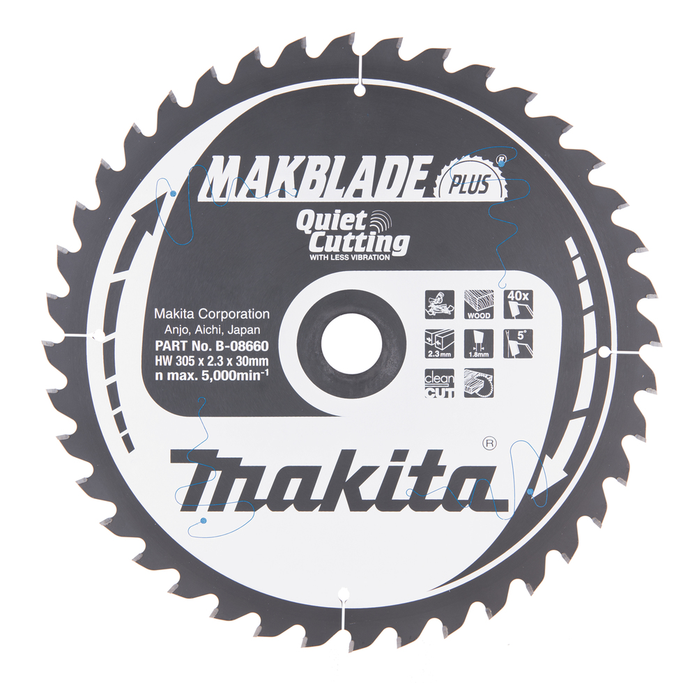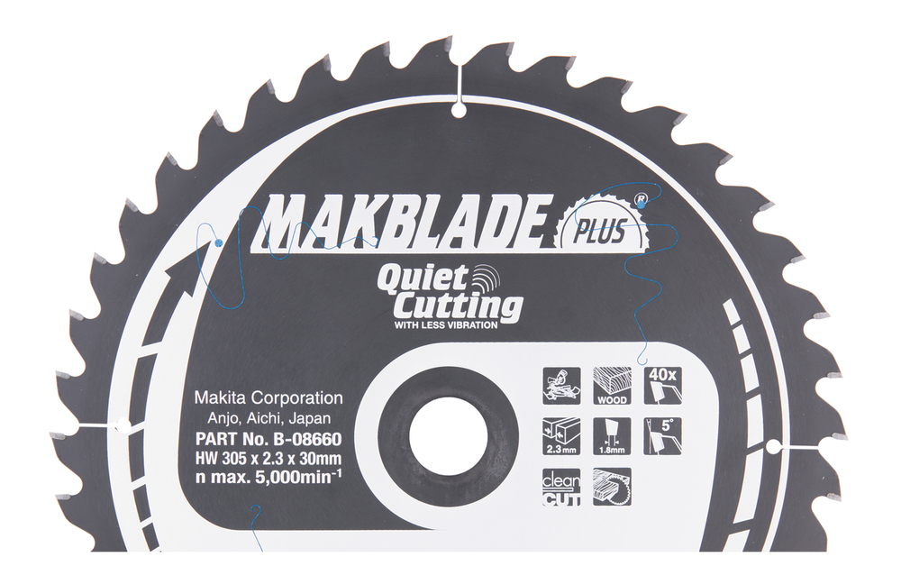 MakBlade Plus is an extremely quiet, durable and low-vibration 305mm saw blade with 40 teeth for cutting wood. Suitable to use with mitre saws and table saws. Kerf is 2.3mm and 30mm arbor hole.