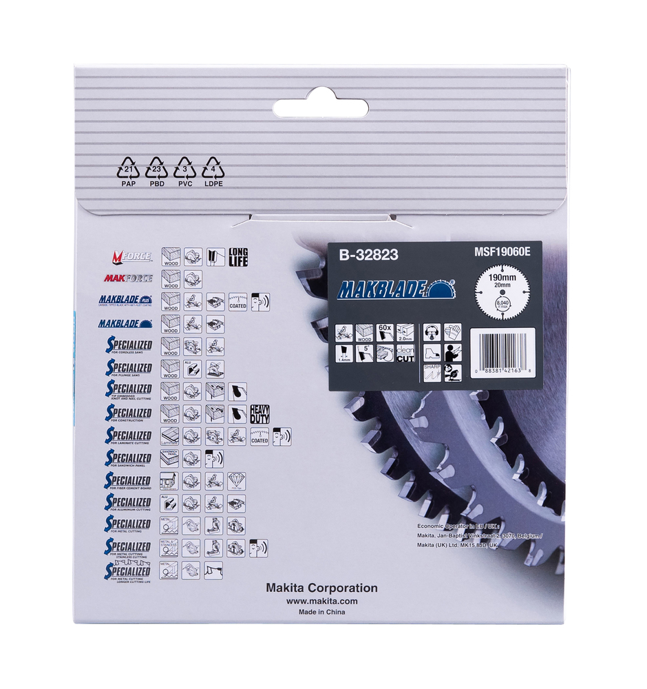MakBlade circular saw blade has a 190mm diameter and features 60 teeth for sawing wood. It leaves a neat sawing mark and is suitable for use with mitre saws. The blade is carbide tipped for increased efficiency. It has 2.0mm kerf and 20mm arbor hole.