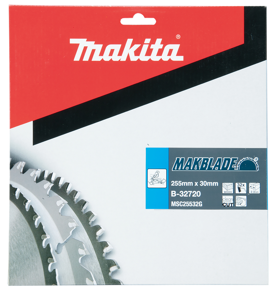 MakBlade circular saw blade has a 255mm diameter and features 32 teeth for sawing wood. It leaves a neat sawing mark and is suitable for use with mitre saws and table saws. The blade is carbide tipped for increased efficiency. It has 2.3mm kerf and 30mm arbor hole.