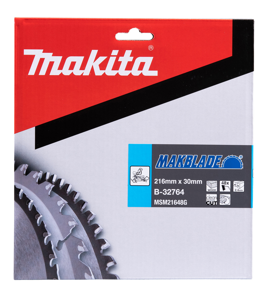 MakBlade circular saw blade has a 216mm diameter and features 48 teeth for sawing wood. It leaves a neat sawing mark and is suitable for use with mitre saws. The blade is carbide tipped for increased efficiency. It has 2.4mm kerf and 30mm arbor hole.