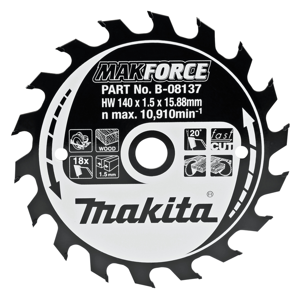 MAKFORCE circular saw blade with 140mm diameter for sawing wood. The blade leaves a clean cut and is ideal for hand-held circular saws. The blade has 18 teeth, a kerf of 1.5mm and 15.88mm arbor hole.