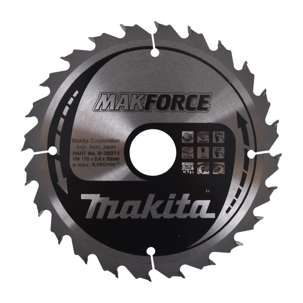 MAKFORCE circular saw blade with 170mm diameter for sawing wood. The blade leaves a clean cut and is ideal for hand-held circular saws. The blade has 24 teeth, a kerf of 2.4mm and 30mm arbor hole.
