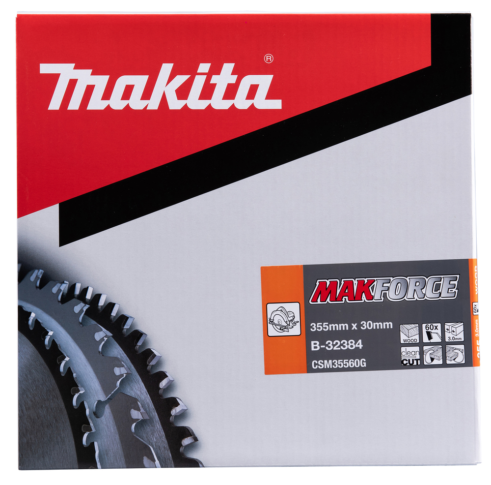 MAKFORCE circular saw blade with 355mm diameter for sawing wood. The blade leaves a clean cut and is ideal for hand-held circular saws. The blade has 60 teeth, a kerf of 3.0mm and 30mm arbor hole.