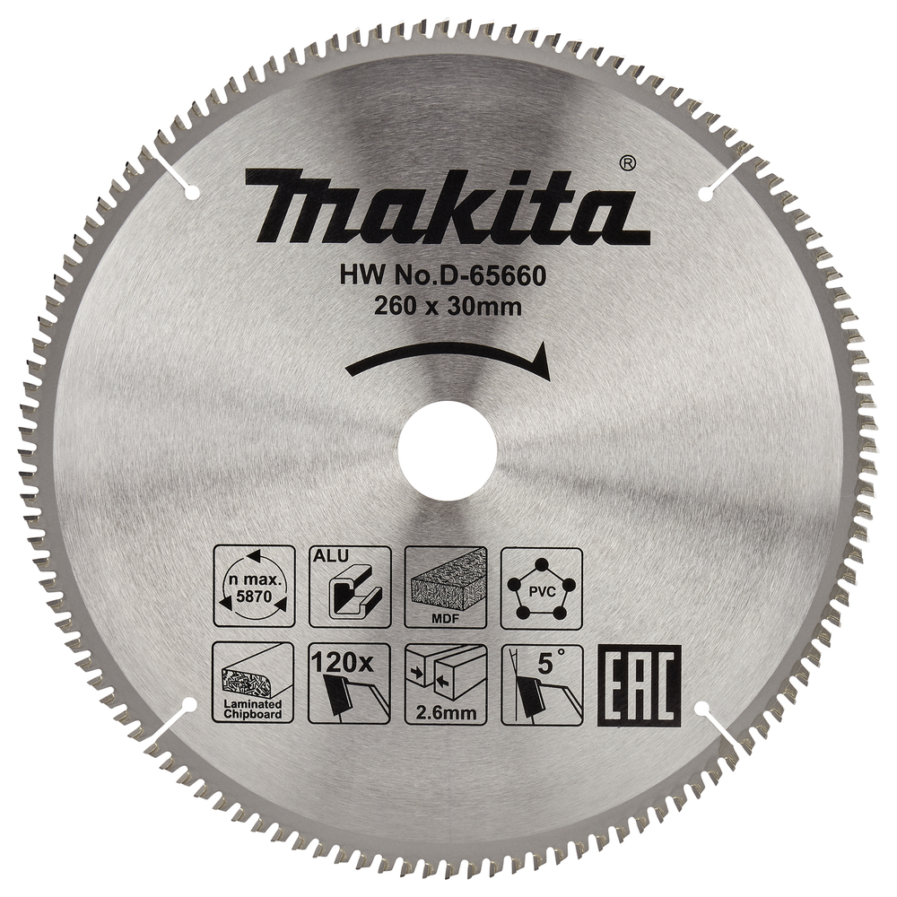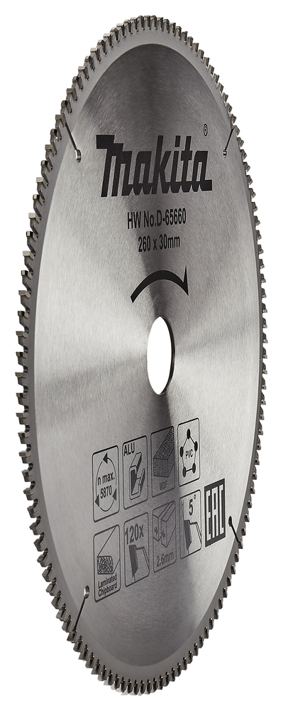 Multi-purpose circular saw blade with 260mm diameter for cutting aluminium, MDF, chipboard and PVC. Suitable for use with mitre saws. Carbide tipped for efficiency. The blade has 120 teeth, a kerf of 2.6mm and a hole diameter of 30mm.