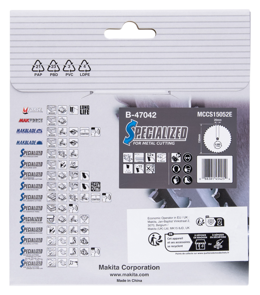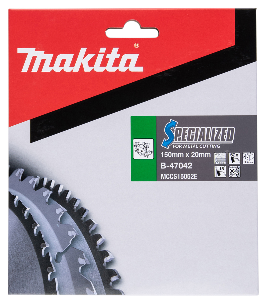 SPECIALIZED saw blade with 150mm diameter for cutting metal. The blade has 52 tungsten carbide tipped teeth, a kerf of 1.4mm and hole diameter of 20mm. Suitable for cutting thin sheet steel up to 1.0mm