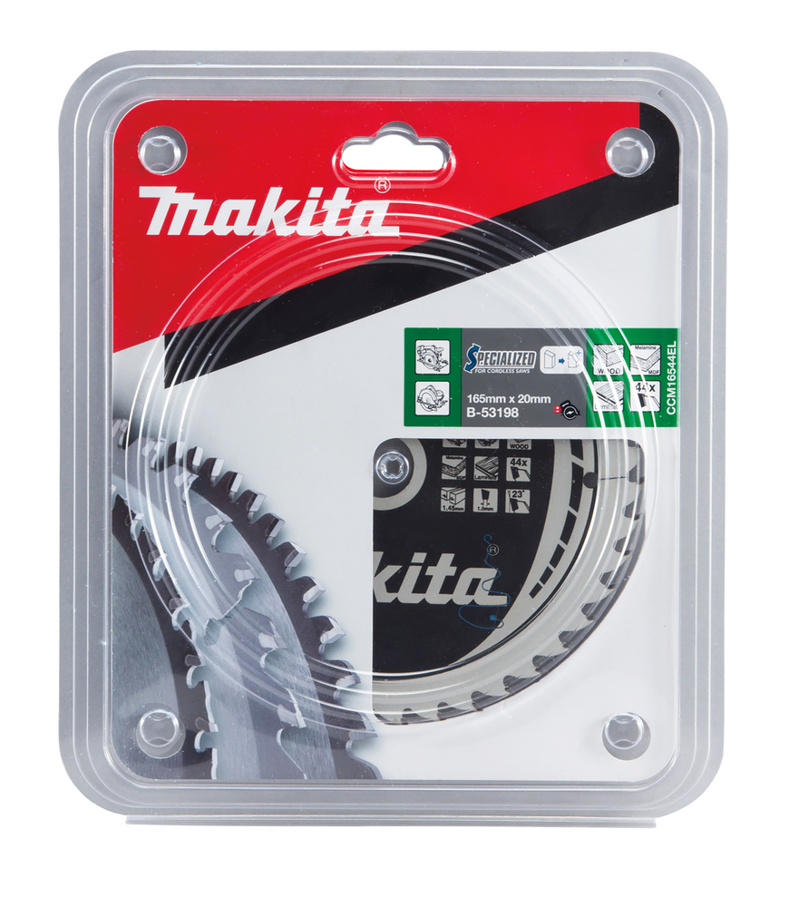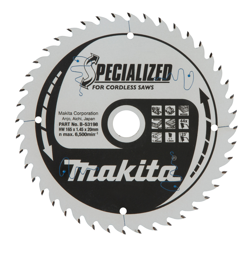 SPECIALIZED saw blade with 165mm diameter for cutting melamine and wood. The blade has 44 tungsten carbide tipped teeth, a kerf of 1.45mm and hole diameter of 20mm.