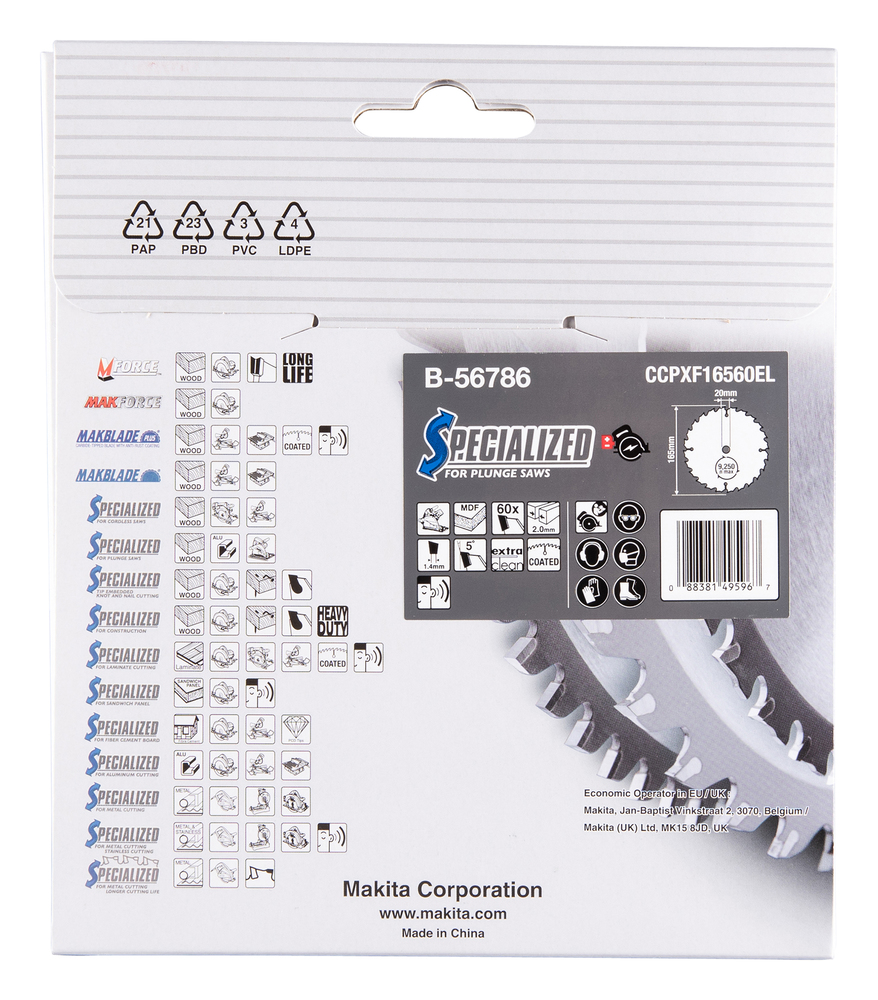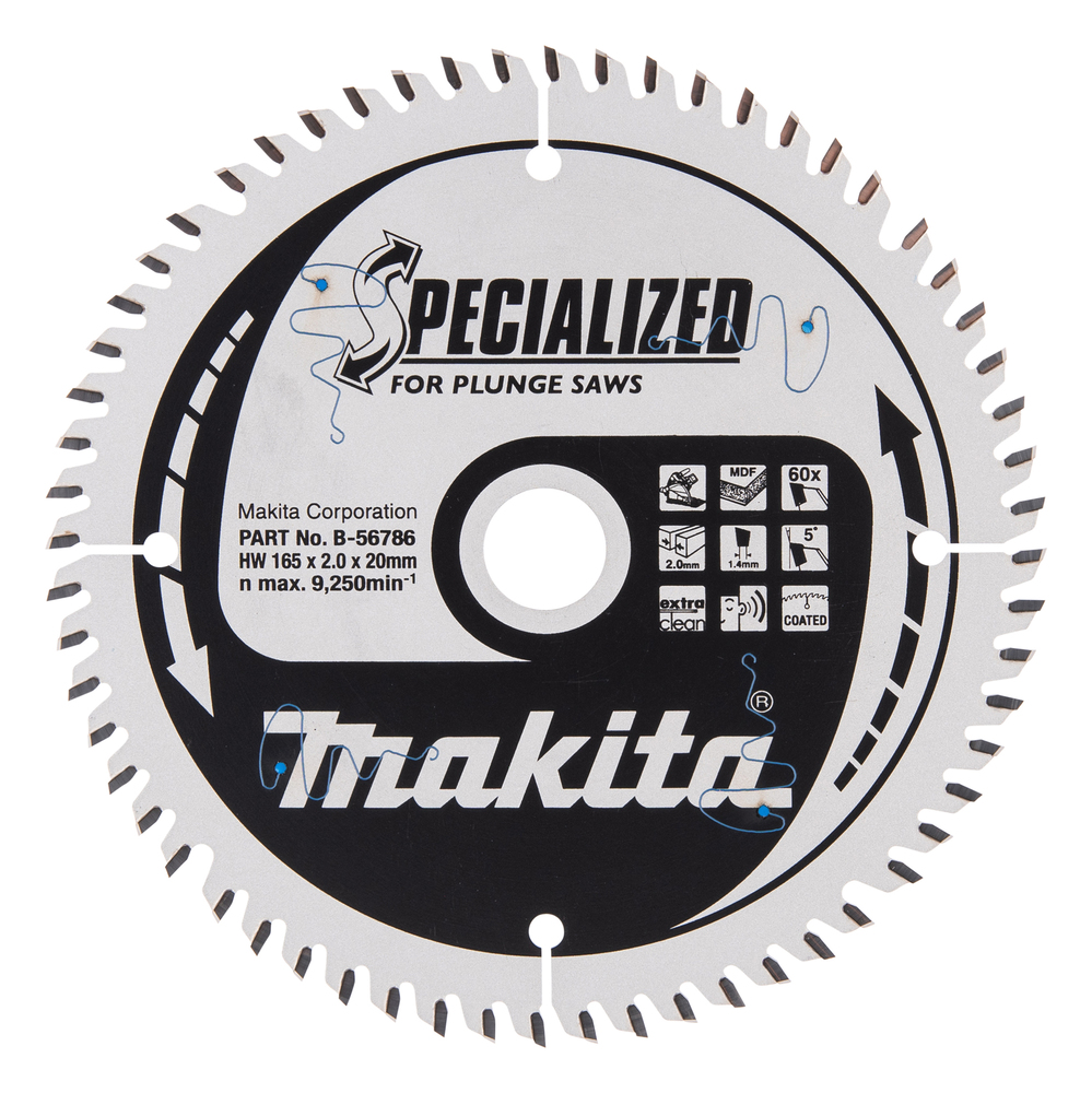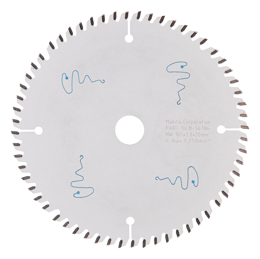 SPECIALIZED saw blade with 165mm diameter for cutting melamine and wood. The blade has 60 tungsten carbide tipped teeth, a kerf of 2.0mm and hole diameter of 20mm.