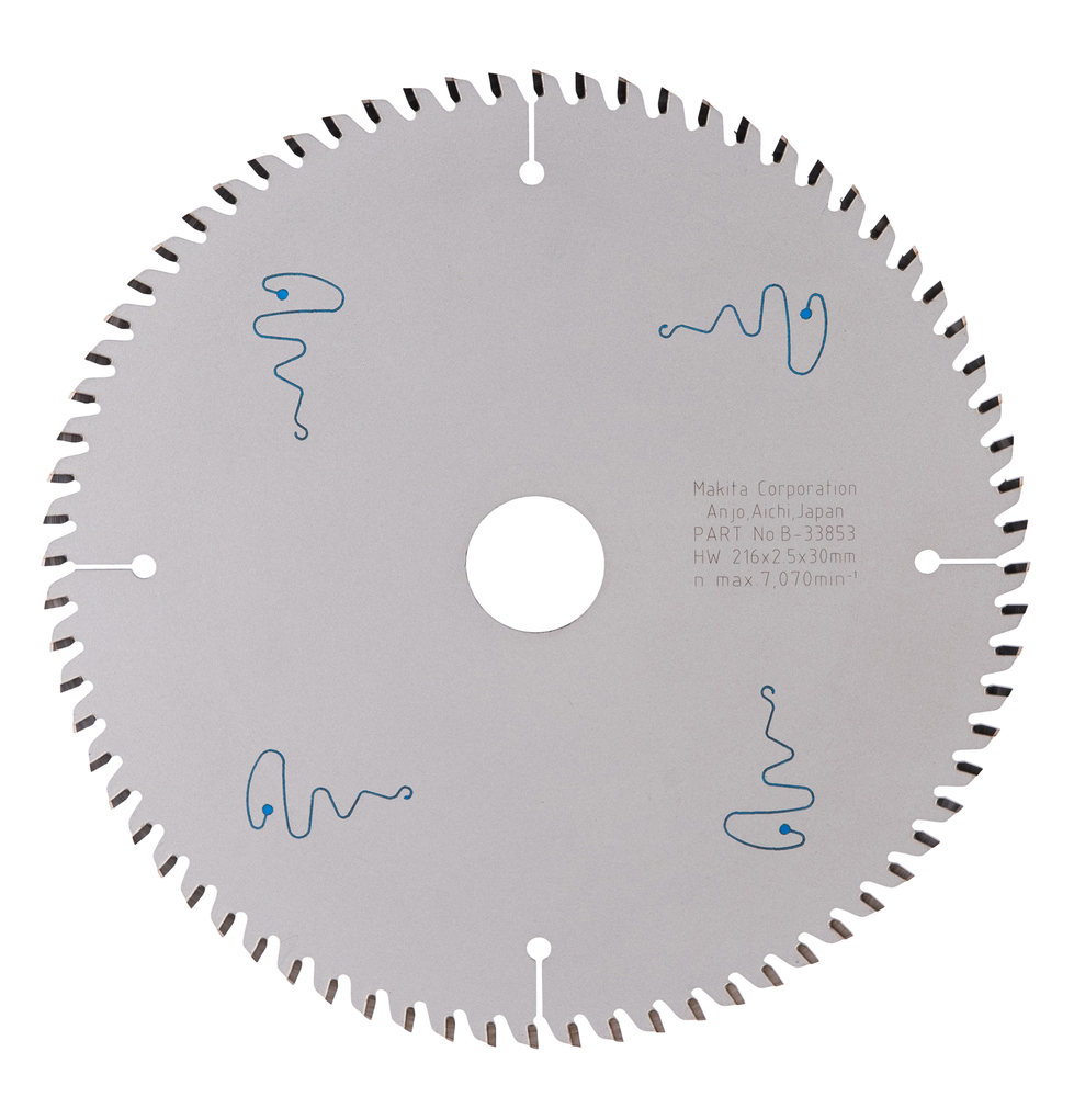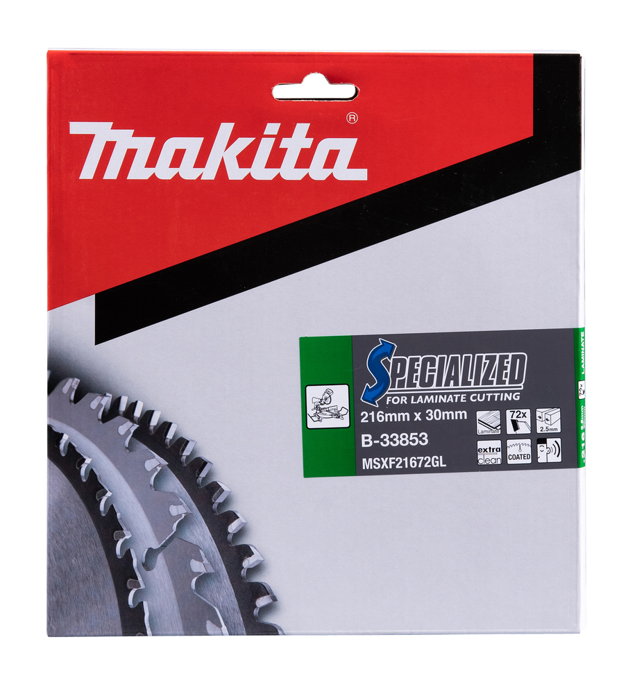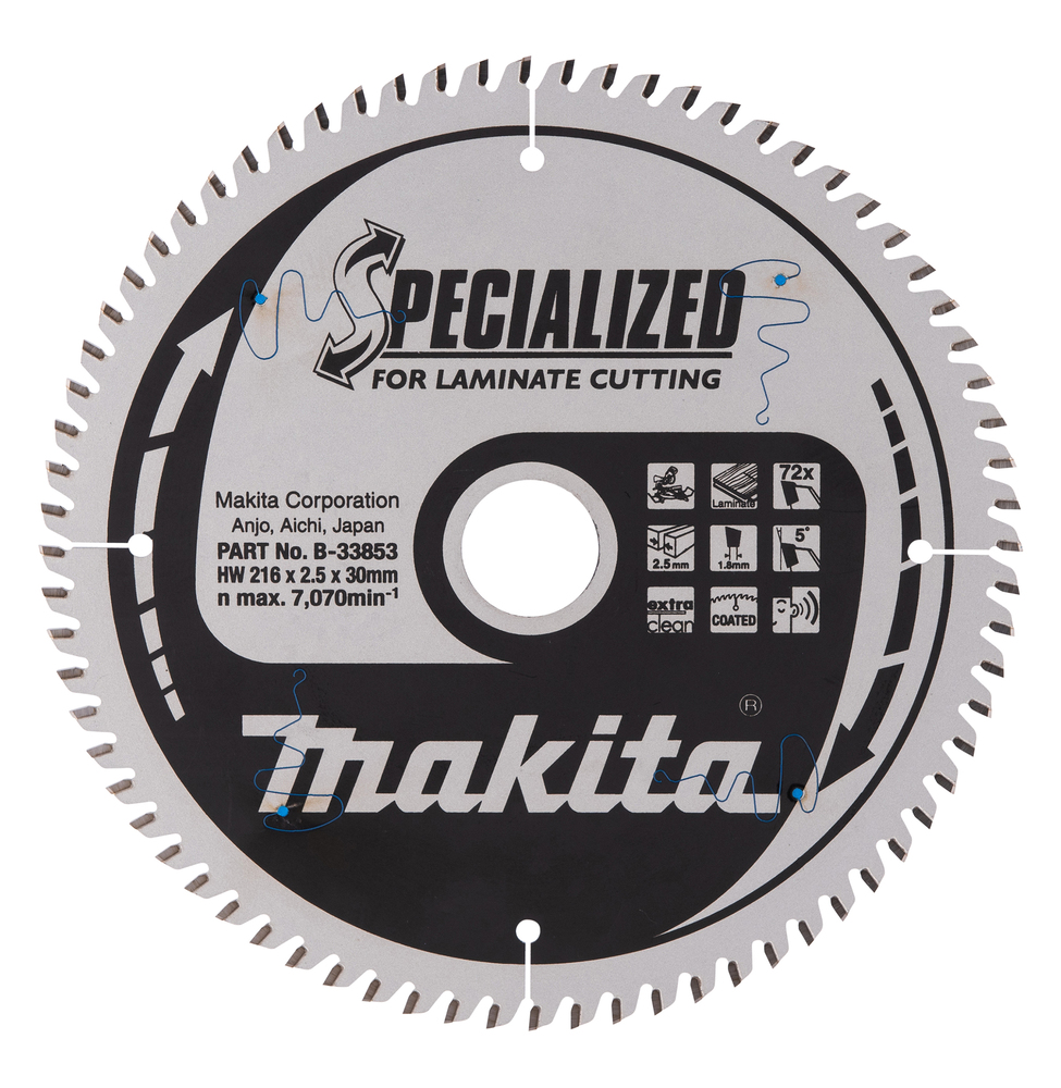 SPECIALIZED saw blade with 216mm diameter for cutting laminate and wood. The blade has 72 tungsten carbide tipped teeth, a kerf of 2.5mm and hole diameter of 30mm.