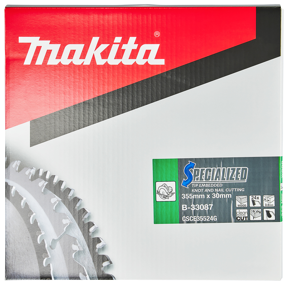 SPECIALIZED saw blade with 355mm diameter for cutting nail embedded wood. The blade has 45 tungsten carbide tipped teeth, a kerf of 3.0mm and hole diameter of 30mm.