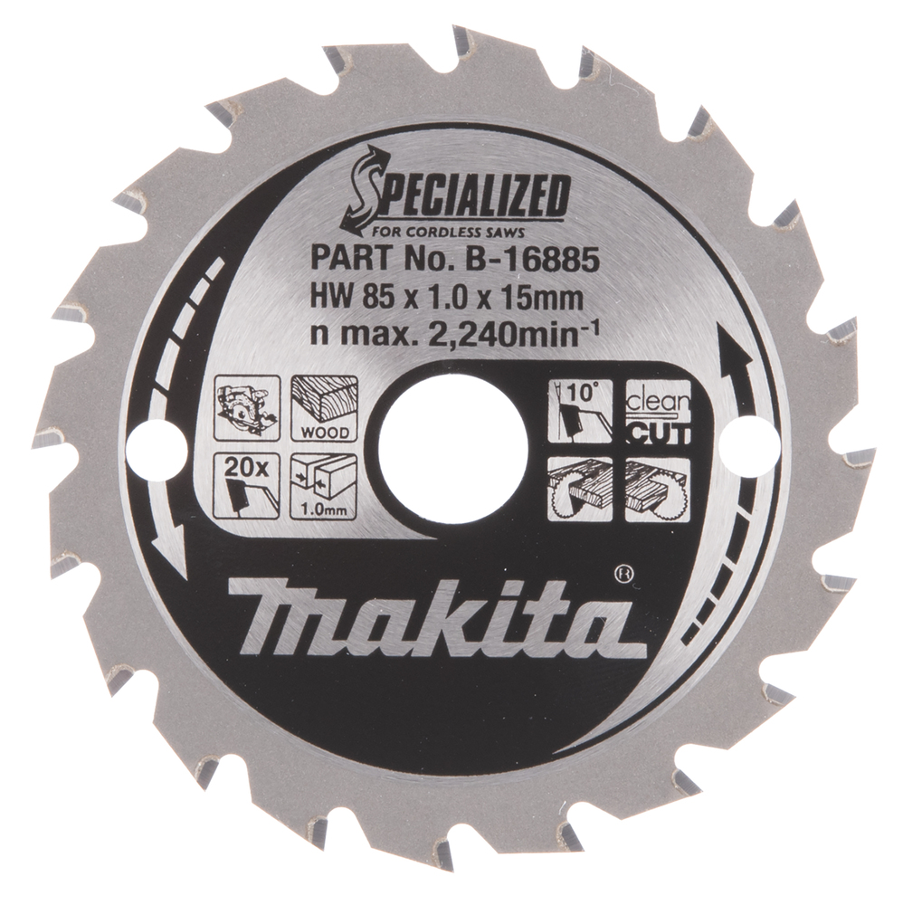 SPECIALIZED saw blade with 85mm diameter for cutting wood. The blade has 20 tungsten carbide tipped teeth, a kerf of 1.0mm and hole diameter of 15mm.