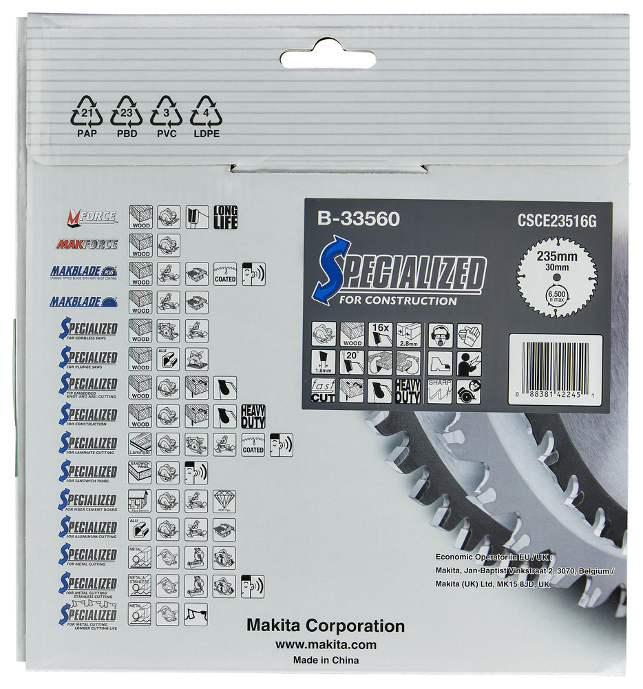 SPECIALIZED saw blade with 235mm diameter for cutting wood with nails, timber with concrete residue & chipboard. Suitable for use with hand-held circular saws. The blade has 16 tungsten carbide tipped teeth, a kerf of 2.8mm and hole diameter of 30mm.