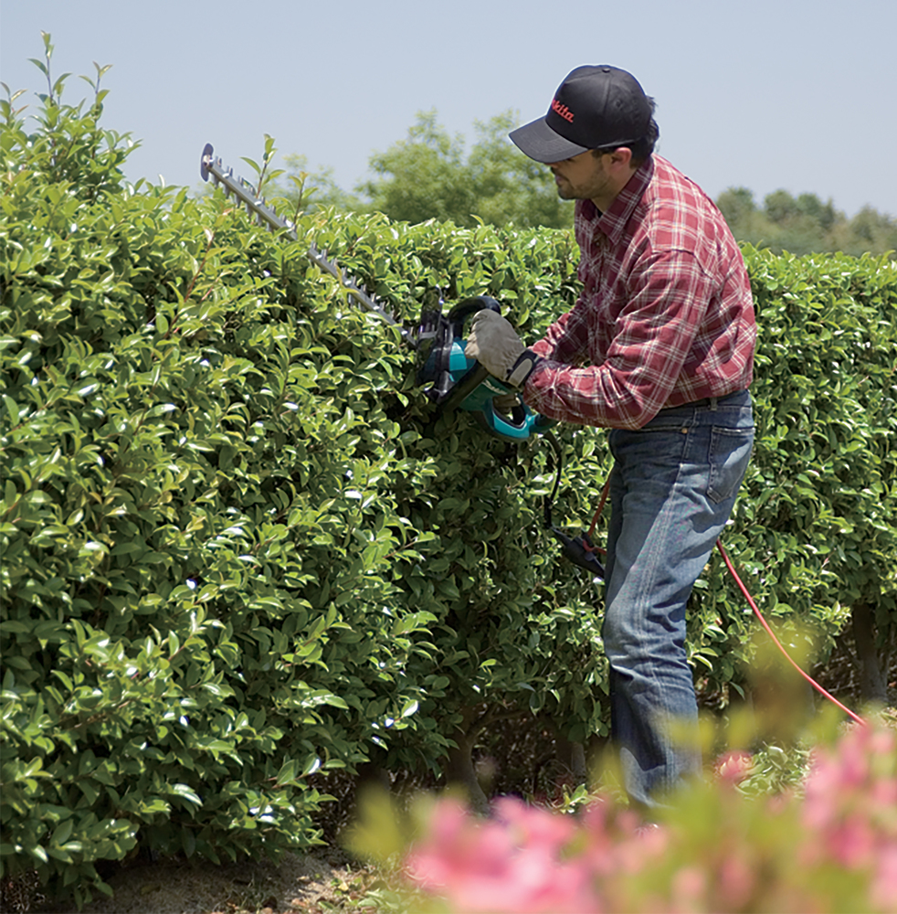 Electric 670 W hedge trimmer with a 750 mm blade for gardening. Two-handed safety switches offer added safety, and the tool has low noise levels.