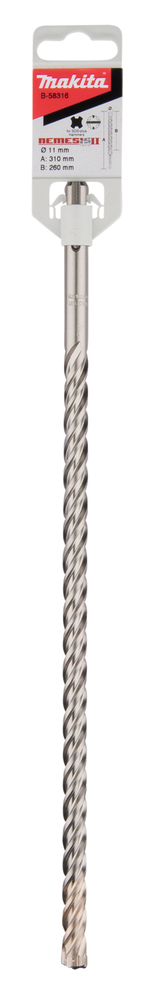 Nemesis II SDS-PLUS drill bit for drilling into reinforced concrete. The centreing tip and solid 4 cutter tungsten carbide tip ensures precise, optimum and fast drilling. This bit has an overall length of 310mm, working length of 260mm and diameter of 11mm.