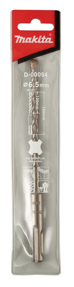 SDS-PLUS hammer drill bit for drilling masonry & concrete. The solid carbide tip with centreing point & optimised flutes offers fast drilling speeds and increased working efficiency. This bit has an overall length of 160mm, working length of 100mm and diameter of 6.5mm.