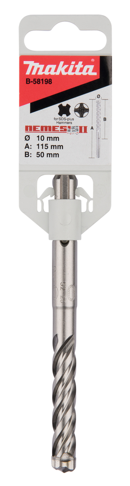 Nemesis II SDS-PLUS drill bit for drilling into reinforced concrete. The centreing tip and solid 4 cutter tungsten carbide tip ensures precise, optimum and fast drilling. This bit has an overall length of 115mm, working length of 50mm and diameter of 10mm.