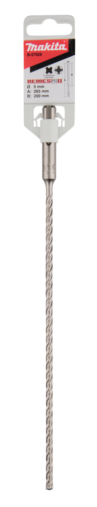 Nemesis II SDS-PLUS drill bit for drilling into reinforced concrete. The centreing tip and solid 4 cutter tungsten carbide tip ensures precise, optimum and fast drilling. This bit has an overall length of 265mm, working length of 200mm and diameter of 5mm.