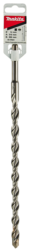 SDS-PLUS hammer drill bit for drilling concrete. The double-edged blade allows fast drilling & the tungsten carbide tip increases working efficiency. This bit has an overall length of 310mm, working length of 260mm and diameter of 14mm.