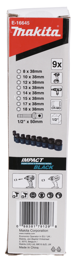 9 Piece Impact Black Impact Socket Set . 1/2″ in sizes 8, 10,12, 13, 14, 15, 17 & 18mm. Includes an impact socket adapter