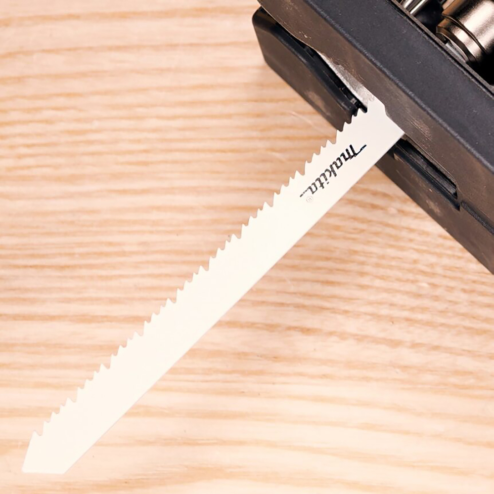 Jigsaw blade with milled and set teeth for cutting materials such as wood, plastics, aluminum and metal. Overall length is 130mm with a working length of 105mm and 10 – 14 TPI. Pack contains 5 blades.