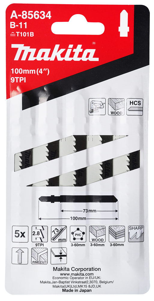 Jigsaw blade with ground and taper ground teeth for cutting materials such as wood and PVC. Overall length is 100mm with a working length of 73mm and 9 TPI. Pack contains 5 blades.