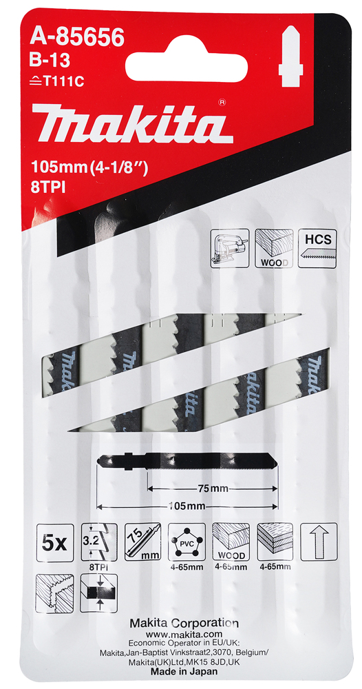 Jigsaw blade with milled and side set teeth for cutting materials such as wood and plastics. Overall length is 105mm with a working length of 75mm and 8 TPI. Pack contains 5 blades.