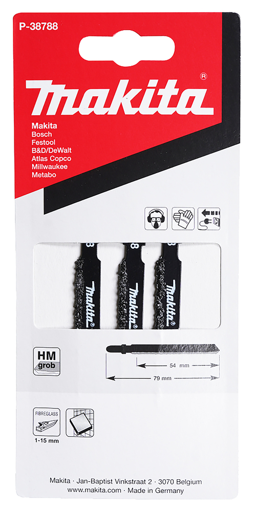 Jigsaw blade with coarse carbide grit for cutting materials such as fiberglass and tile. Overall length is 79mm with a working length of 54mm. Pack contains 3 blades.