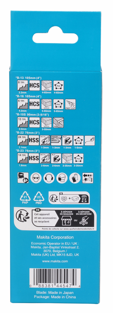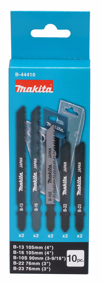 Jigsaw blade set for cutting multiple materials such as wood, PVC, aluminum metal and stainless steel. Overall length is 76-105mm with a working length of 51-7 mm. Pack contains 10 blades.