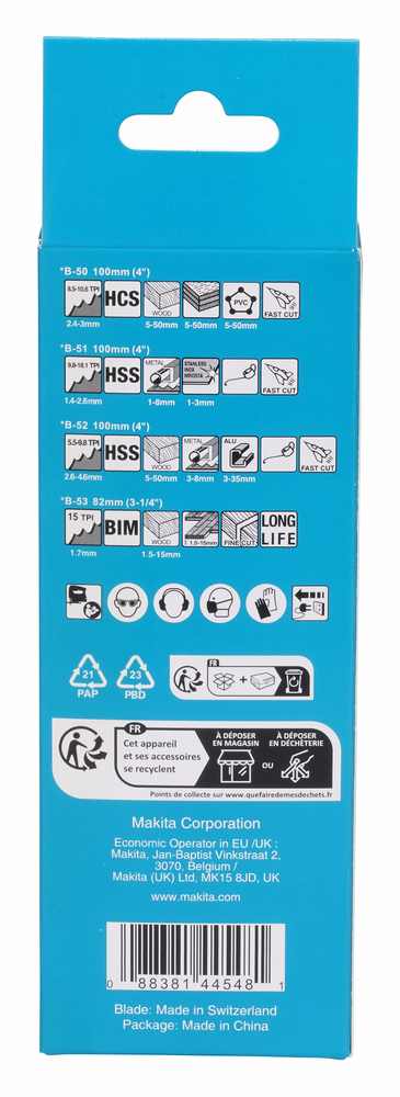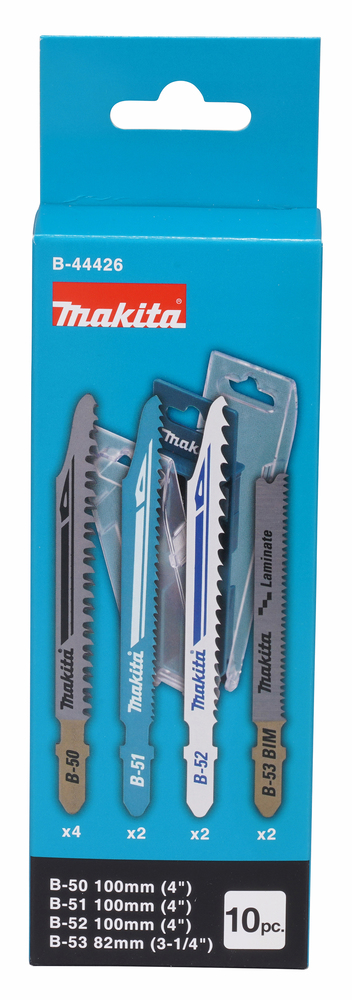 Jigsaw blade set for cutting multiple materials such as wood, PVC, laminate, metal and stainless steel. Overall length is 82-100mm with a working length of 59-73mm. Pack contains 10 blades.