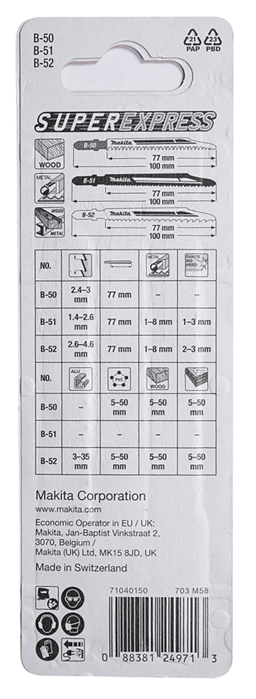 Jigsaw blade set for cutting multiple materials such as wood, PVC, metal and stainless steel. Overall length is 100mm with a working length of 73mm. Pack contains 3 blades.
