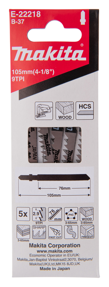 Jigsaw blade with ground and taper ground teeth for cutting materials such as wood and plastics. Overall length is 105mm with a working length of 76mm and 9 TPI. Pack contains 5 blades.