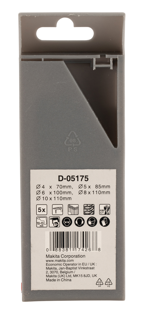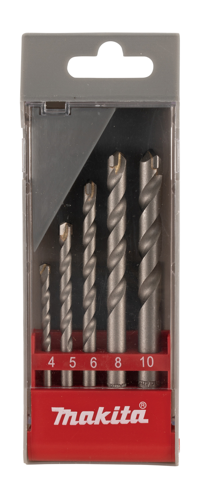 Drill bit set for drilling concrete. The set includes concrete drill bits with tungsten carbide tips. The drill bits overall length is 70-110mm, with diameter of 4-10mm. The set includes 5 concrete drill bits in a plastic case