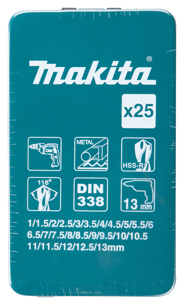 Drill bit set for drilling metal. Set includes HSS-R metal drill bits. The drill bits diameter is 1-13mm. The set includes 25 metal drill bits in a metal case
