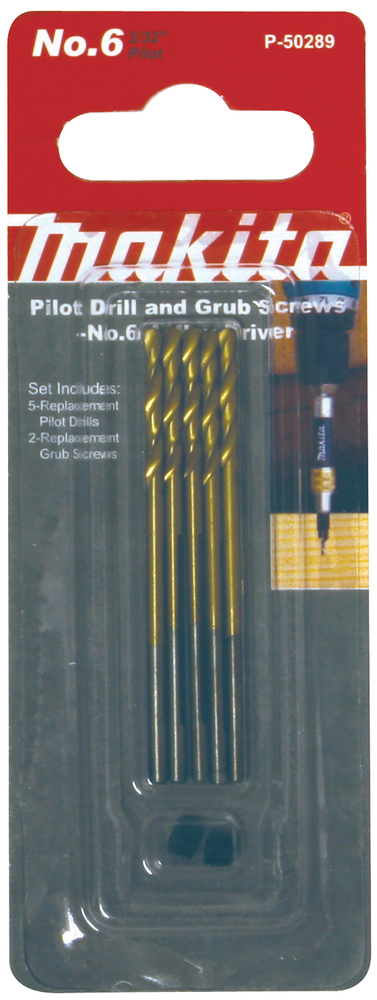 Pilot drill and grub screw set for use with Quad drivers. Set includes 5 no. 6 titanium coated pilot drills 2 grub screws.