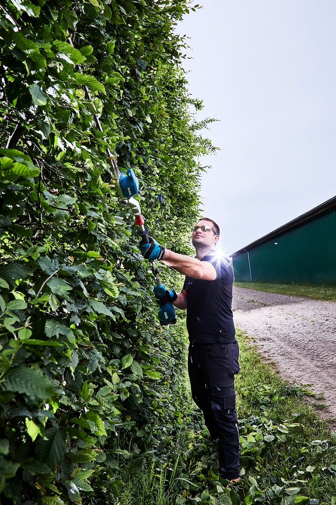 The brushless hedge trimmer with long shaft is very suitable for cutting tall and long hedges. The blade is articulated 115 degrees, making it easy to cut the bush tops. The blade can be folded into the transport position for a full 180 degrees.