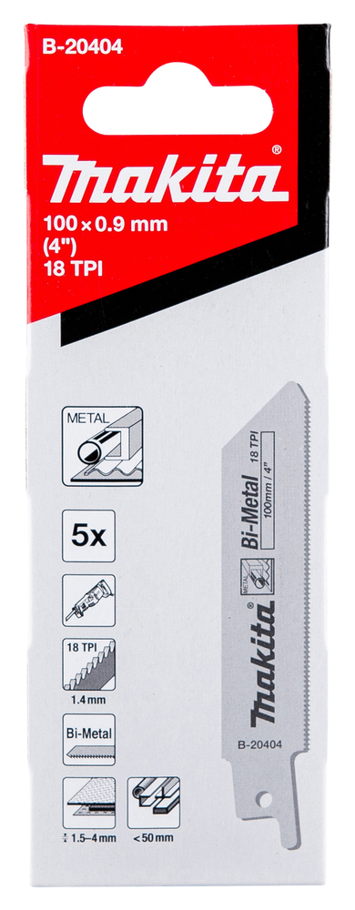 Reciprosaw blade for cutting metal. This Bi-Metal blade has an overall length of 100mm and a working length of 80mm. Blade is 0.9mm thick and has 18 TPI. Pack contains 5 blades.